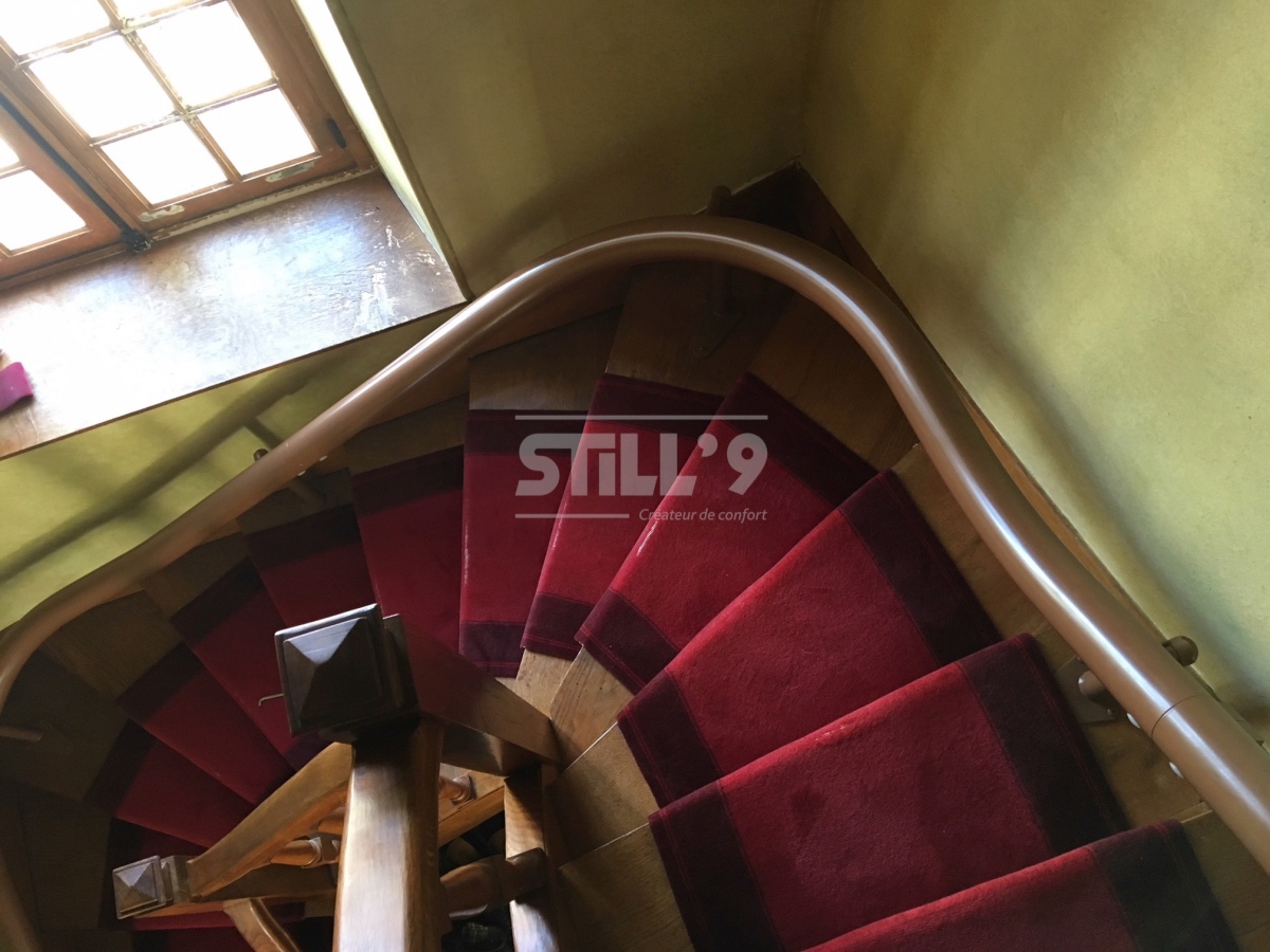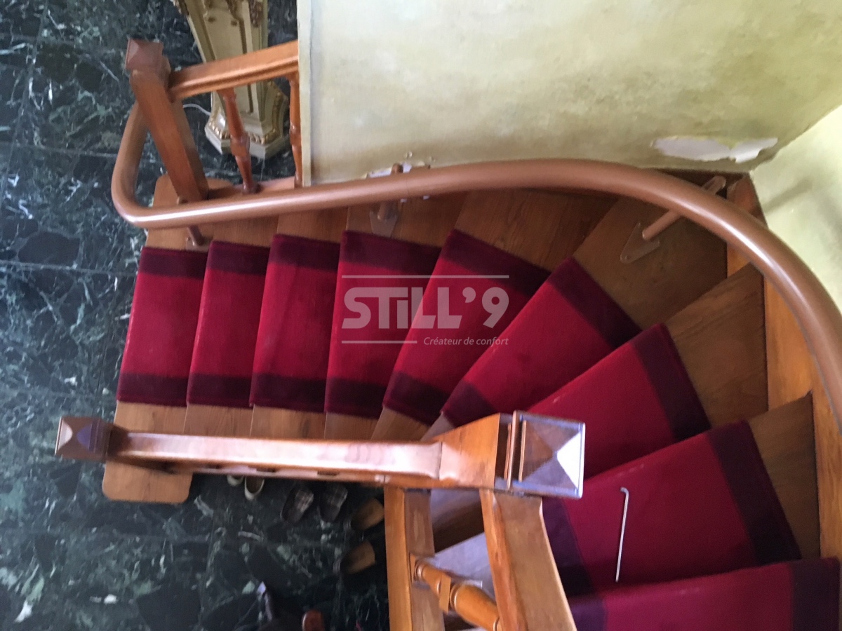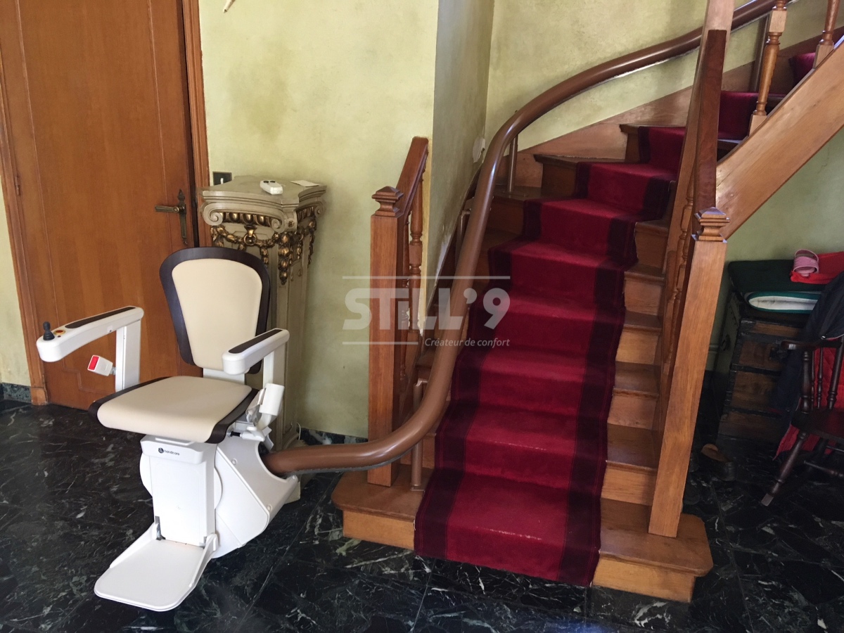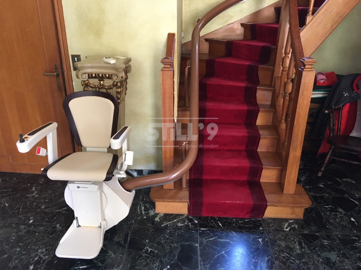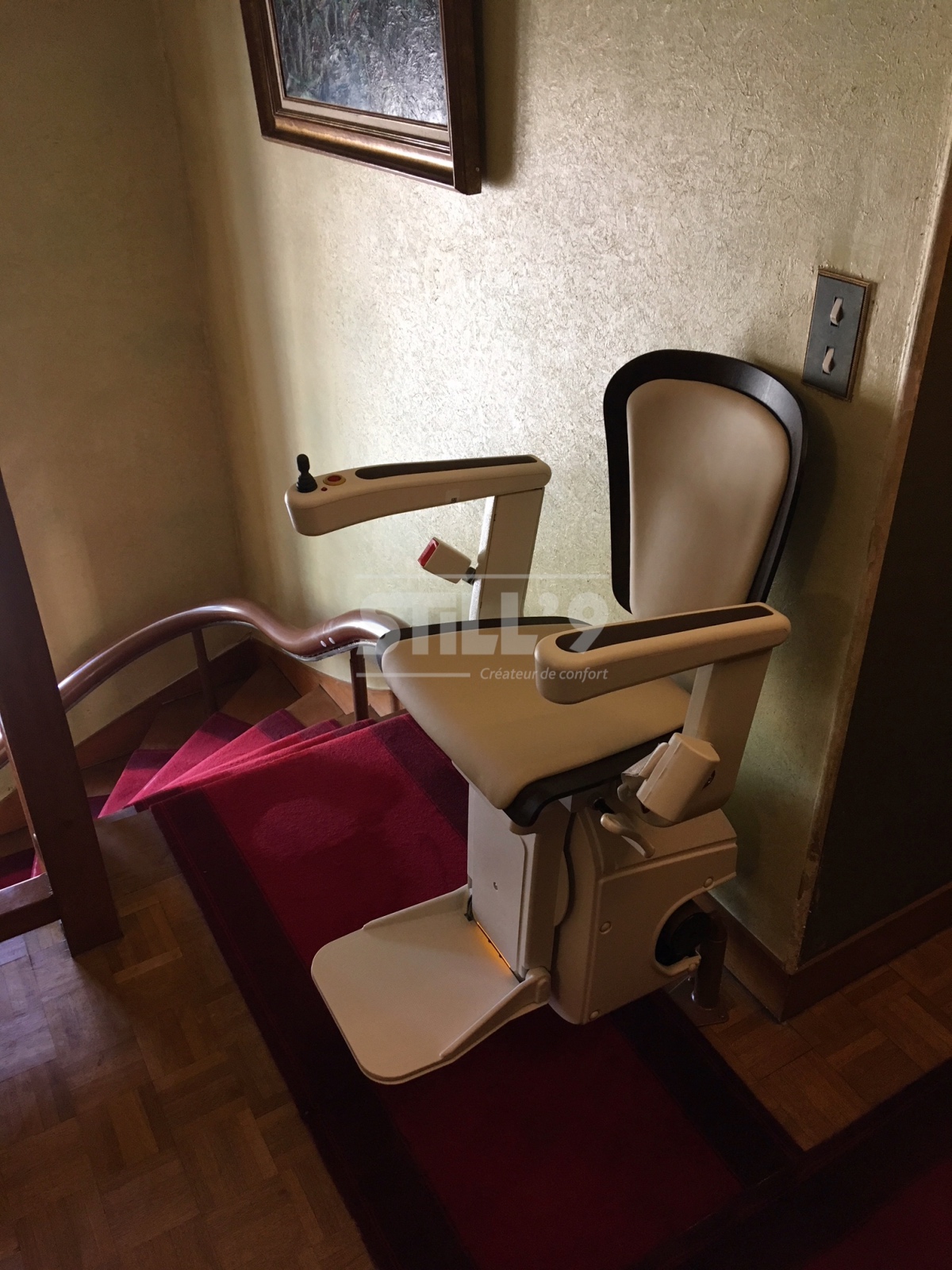 Notre client proche de Augers en Brie 77, a choisi un rail de couleur marron afin qu'il s'intègre au mieux à la décoration intérieure. Quant au siège, il s'agit du modèle Alliance de couleur beige avec un cadre en bois. Ce modèle est particulièrement apprécié et très facile d'entretien. Ce monte escalier pour personnes âgées possède une option choisie par notre client : il s'agit du repose pied automatique et lumineux, option très pratique quand on a des difficultés à se baisser.