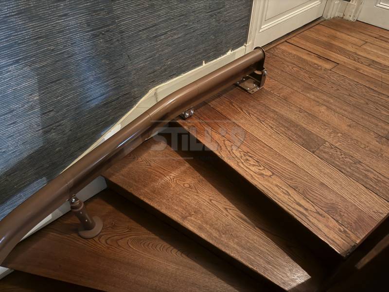 Notre cliente a choisi un rail marron qui s'harmonise très bien avec la couleur de l'escalier qui est également foncée.