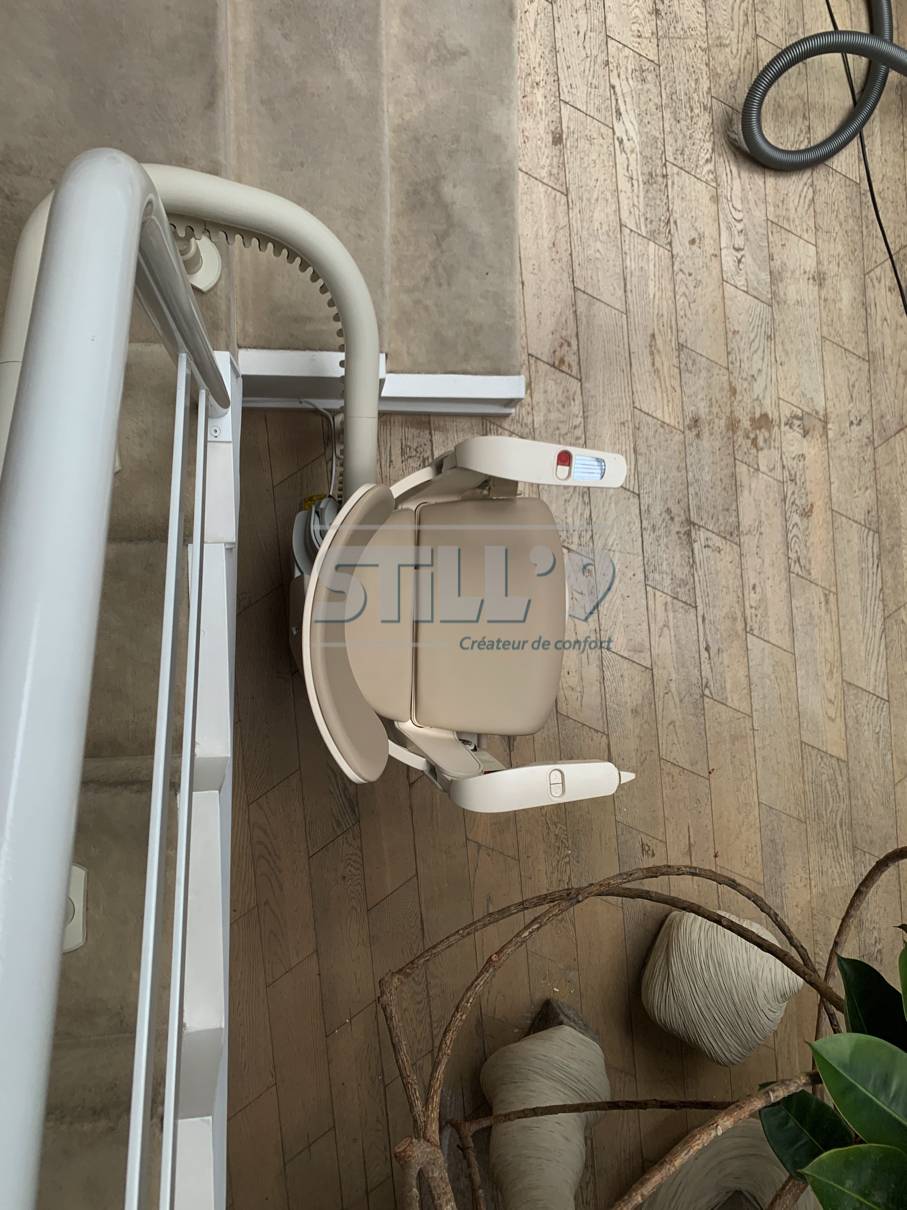 L'escalier comporte des virages, nous nous sommes donc adaptés à cette configuration. Nous avons opté pour un virage en stationnement en bas de l'escalier pour éviter l'encombrement du fauteuil monte personne. Celui-ci est donc en stationnement contre l'escalier permettant ainsi un dégagement total.